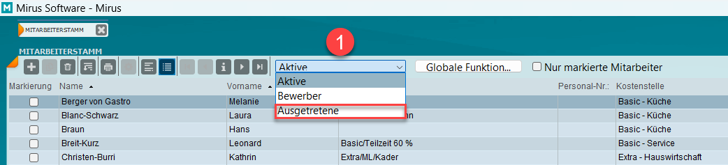 - Suchen Sie den betreffenden Mitarbeiter in der Mitarbeiterliste. Er befindet sich wahrscheinlich in der Kategorie „ Ausgetretene“. Öffnen Sie dann den Eintrag mit einem Doppelklick.
