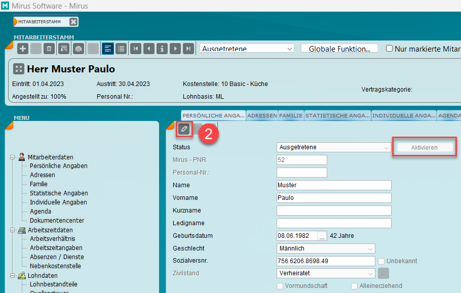 Eine Person wird nur einmal im Mitarbeiterstamm gepflegt. Damit die Personalstammdaten bearbeitet werden können, muss der «Status» auf Aktiv gesetzt werden: