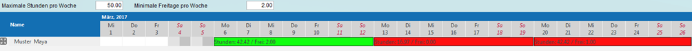 In der Wochenübersicht wird geprüft, ob die wöchentliche Höchstarbeitszeit (50 Stunden) und der wöchentliche Ruhetageanspruch (2 Tage) eingehalten wurden.