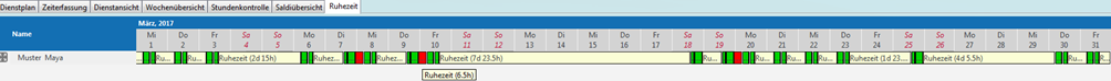 Bei den Ruhezeiten wird geprüft, ob die Nachtruhezeit eingehalten wurde. Wenn die Markierung zwischen zwei Diensten «rot» angezeigt wird, dann ist die Nachtruhezeit unterschritten worden.