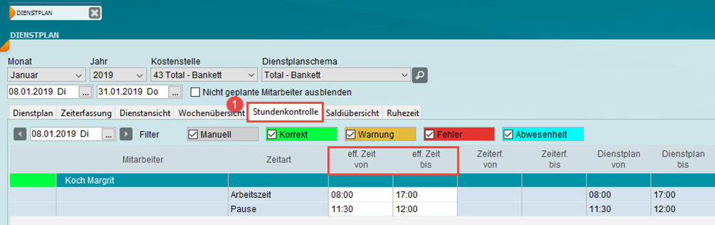 1. Zum Bearbeitern der Zeiten überschreiben Sie die «eff. Zeit von» beziehungsweise «eff. Zeit bis».