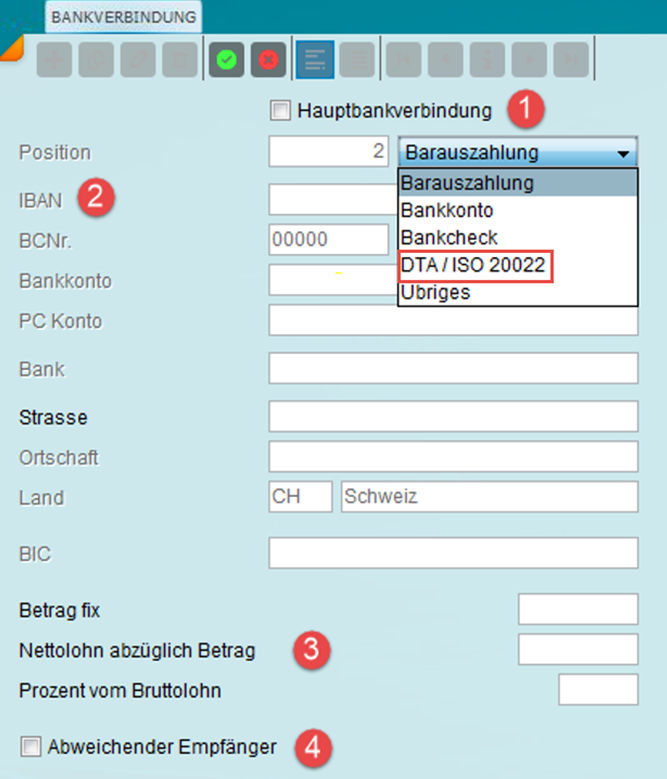 Wenn Sie diese aktivieren, wird die bestehende Zahlungsverbindung des Mitarbeitenden überschrieben. Die Hauptbankverbindung muss unverändert bleiben.Erfassen Sie die IBAN des Betreibungsamtes oder der zuständigen Stelle im Feld IBAN (2).