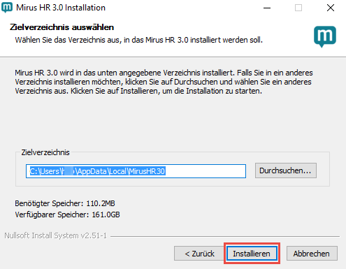 - Bestätigen Sie den vorgeschlagenen Installationspfad mit Installieren.