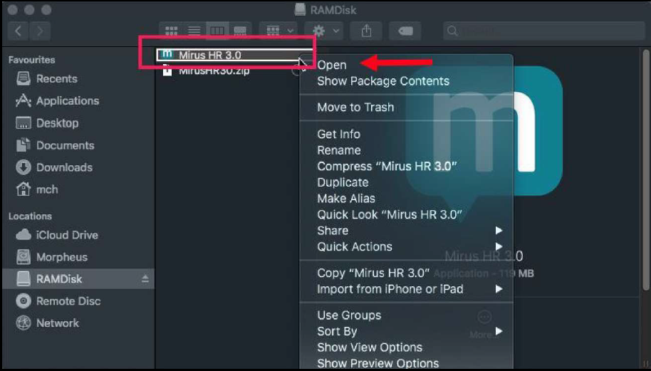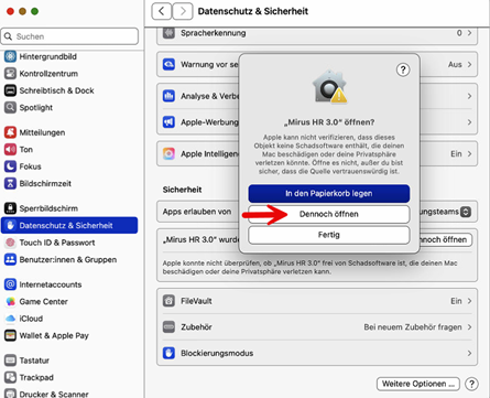 - Werden mehrere Mandanten (mit verschiedenen Zugang-Links) auf demselben Mac installiert, muss die Applikation nach jeder erfolgten Installation von der Bezeichnung «Mirus HR 3.0» auf eine andere Bezeichnung umbenennt werden, da diese sonst bei der nachfolgenden Installation Überschrieben werden.