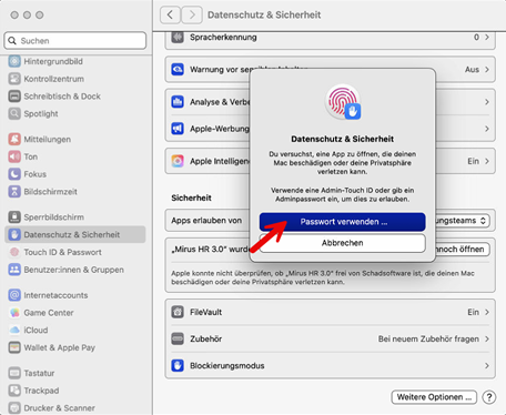 Wenn Ihr Mac das Administratorenpasswort verlangt, geben Sie es ein und bestätigen es.