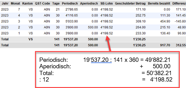 Der Quellensteuerbetrag wird nun für die vergangenen Monate neu ermittelt = CHF 1230.25 und mit dem bereits bezahlten Betrag = CHF 917.70 verrechnet. Die Differenz = CHF 312.55 wird als Quellensteuerabzug in die Lohnabrechnung geschrieben.