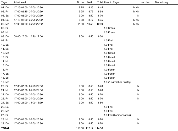 Die Anwesenheitszeiten werden in Normalschrift und die Pausen in Kursivschrift ausgewiesen.
