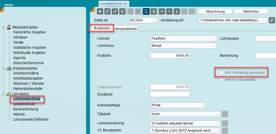 Aktivieren Sie AHV-Freibetrag ignorieren, wenn auf den Freibetrag verzichtet wird.