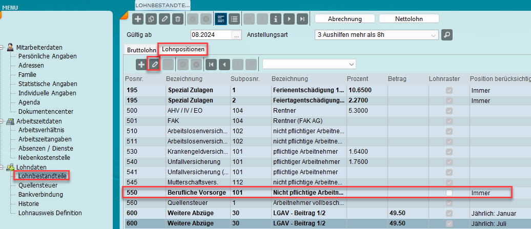 Im Lohnprogramm ist die Position 550 Berufliche Vorsorge entsprechend anzupassen: