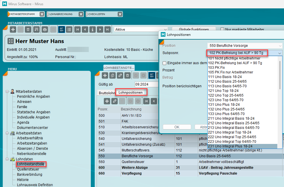 Im Mitarbeiterstamm unter Lohnbestandteilen/Lohnpositionen klicken Sie auf die "Position 550 Berufliche Vorsorge 112" und nehmen die Anpassung vor auf "102 PK-befreiung bei AUF>90 Tage".