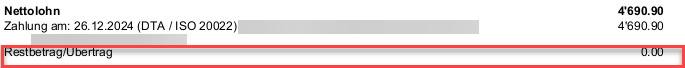 Im Prozess Lohnverarbeitung resp. Subprozess "Lohnabrechnung drucken", kontrollieren Sie jeweils, ob der Restbetrag 0.00 ist. Somit ist gewährleistet, dass Sie im kommenden Lohnmonat keine "Differenzen Vormonat" haben resp. eine Zahlung im Mirus Lohnprogramm durchgeführt haben.