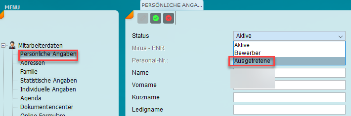 Mitarbeitende, die das Unternehmen verlassen haben, können Sie im Mitarbeiterstamm unter "Persönliche Angaben" auf Ausgetreten setzen.