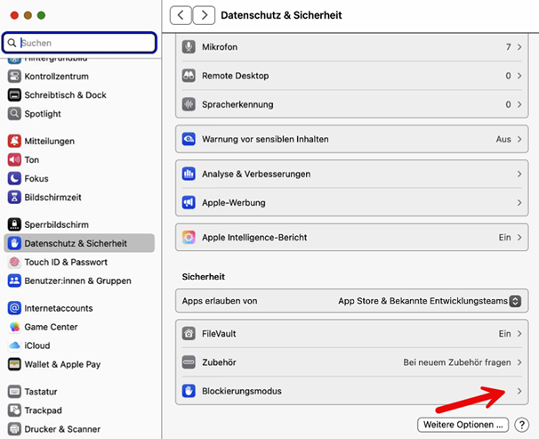 - Gehen Sie zu "Datenschutz & Sicherheit" und wählen Sie den Bereich "Bedienungshilfen".