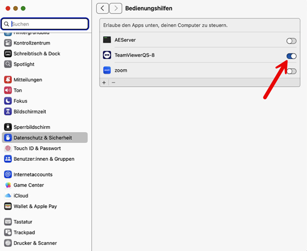 - Aktivieren Sie dort die Berechtigung für TeamViewer.