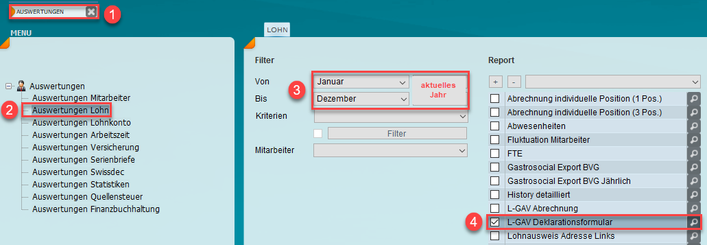 Das L-GAV-Deklarationsformular finden Sie im Menu (1) Auswertungen in der Rubrik (2) Auswertungen Lohn.