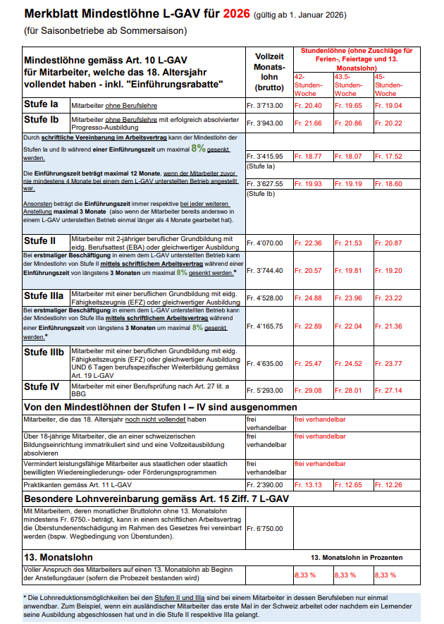 • Welche Mindestlöhne gelten gemäss Landesgesamtarbeitsvertrag (L-GAV) im Jahr 2026?