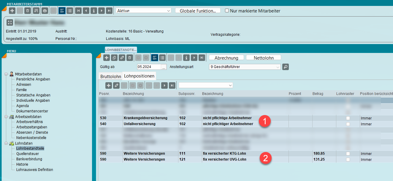 1. Gehen Sie unter "Lohnbestandteile" (1) und wählen Sie die Anstellungsart "9 Geschäftsführer" (2) aus.