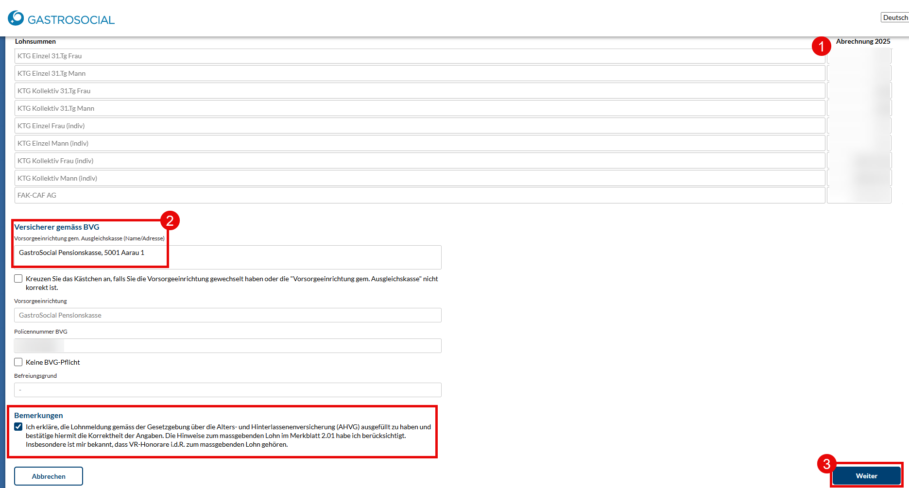 Kontrollieren Sie bei AHV und FAK sowie bei der Swica, falls über GastroSocial versichert, ob die korrekte Pensionskassenadresse hinterlegt ist.