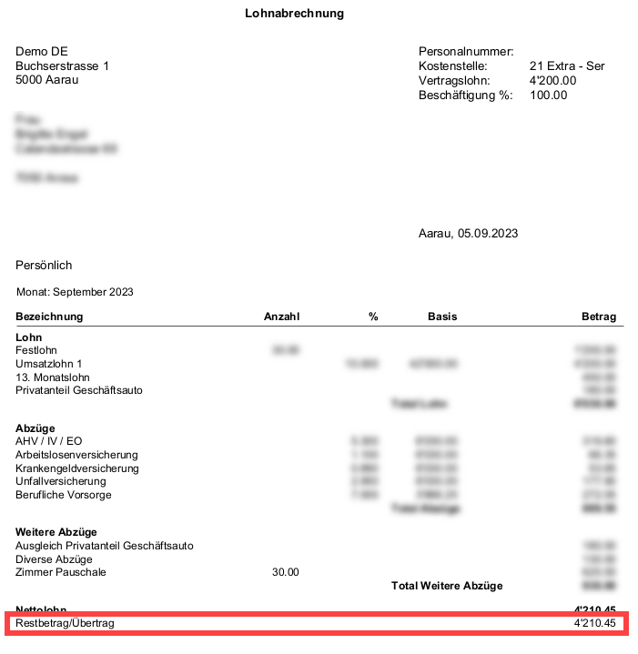 Prüfen Sie in der Lohnabrechnung das Feld Restbetrag / Übertrag.