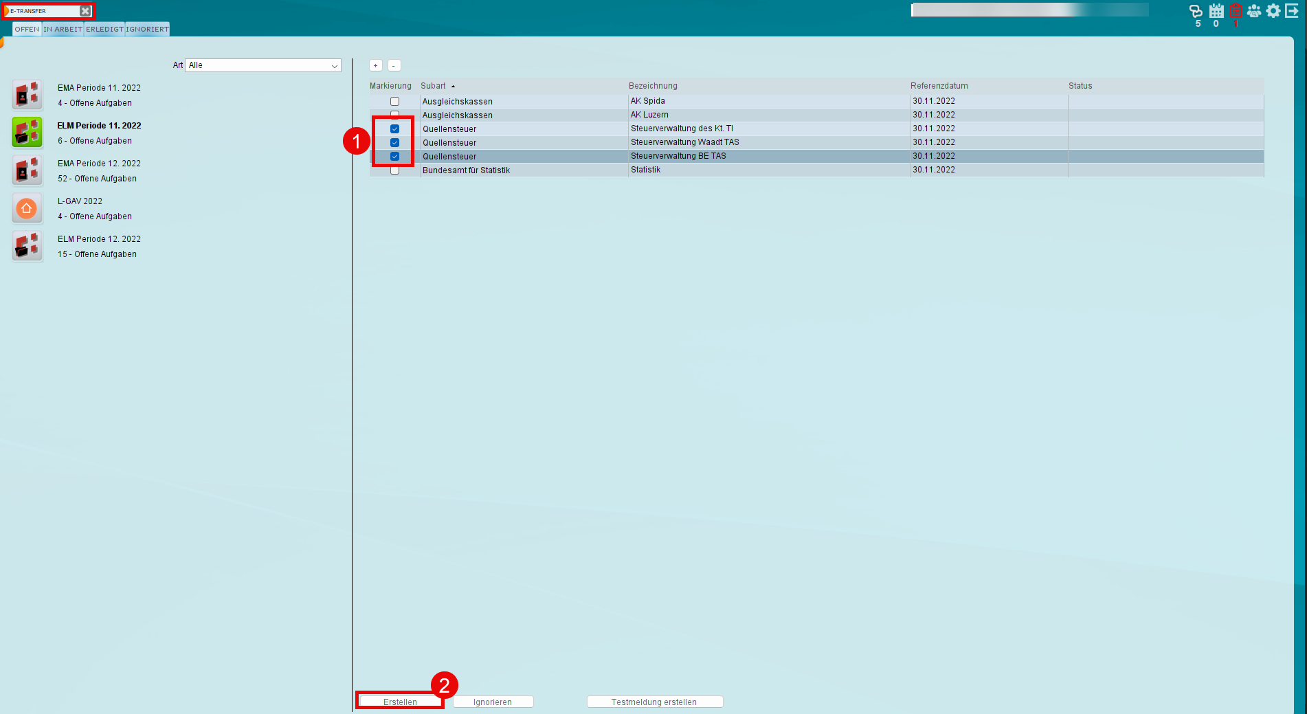 Beachten Sie, dass die Lohnperiode nach Erstellen der ELM (E-Transfer) definitiv abgeschlossen und durch uns nicht mehr geöffnet werden kann. Bitte prüfen Sie deshalb die Löhne sorgfältig: