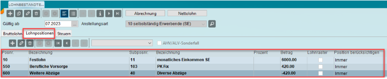 Der persönliche AHV/IV/EO-Beitrag für Selbstständigerwerbende wird auf Grundlage des steuerbaren Einkommens berechnet. Selbstständigerwerbende können sich unter Einhaltung gewisser Bedingungen freiwillig auf einer im Voraus festgelegten Lohnsumme im BVG, UVG und KTG versichern lassen (Fix versicherter Lohn). Nur wenn der Selbständigerwerbende BVG versichert ist, ist er im Lohnprogramm zu erfassen und die Lohnpositionen wie folgt einzurichten: