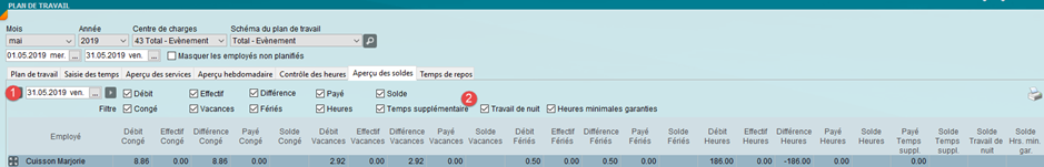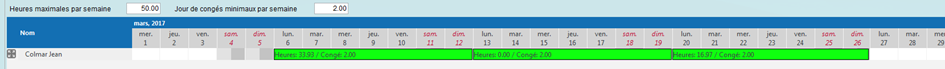 Dans la vue d’ensemble de la semaine, il est possible de vérifier le temps de travail hebdomadaire maximal (50 heures) et respecter le droit hebdomadaire aux jours de repos (2 jours).