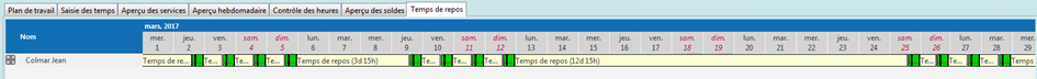 Pour les temps de repos, on vérifie si les heures de repos nocturne sont respectées. Si le marquage entre deux horaires est rouge, le temps de repos nocturne est insuffisant.