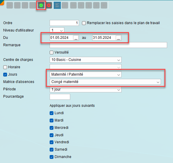 L’indemnité de maternité correspond à 80 % du salaire. La durée complète de la maternité doit être saisie dans miruSocial sans interruption.