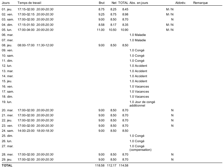 Net (travail normal + travail de nuit) + supplément de temps de travail de nuit = total (heures effectives)