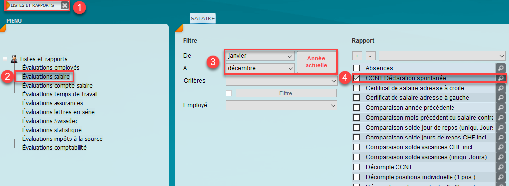 Vous trouverez le formulaire de déclaration CCNT dans le menu (1) Evaluations sous la rubrique (2) "évaluations salaire".
