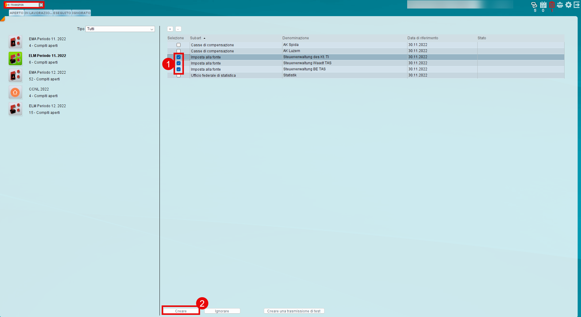 Si prega di notare che, dopo la creazione dell’ELM (E-Transfer), il periodo salariale risulta definitivamente chiuso e non può più essere riaperto da noi. Controllate quindi con attenzione i salari: