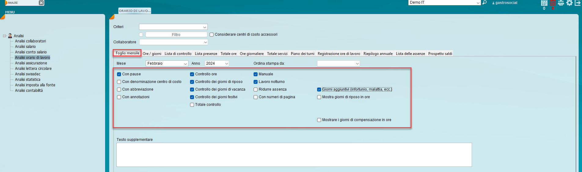Il foglio mensile per il controllo dell'orario di lavoro viene generato nel menu principale Analisi alla voce “Analisi orario di lavoro”.