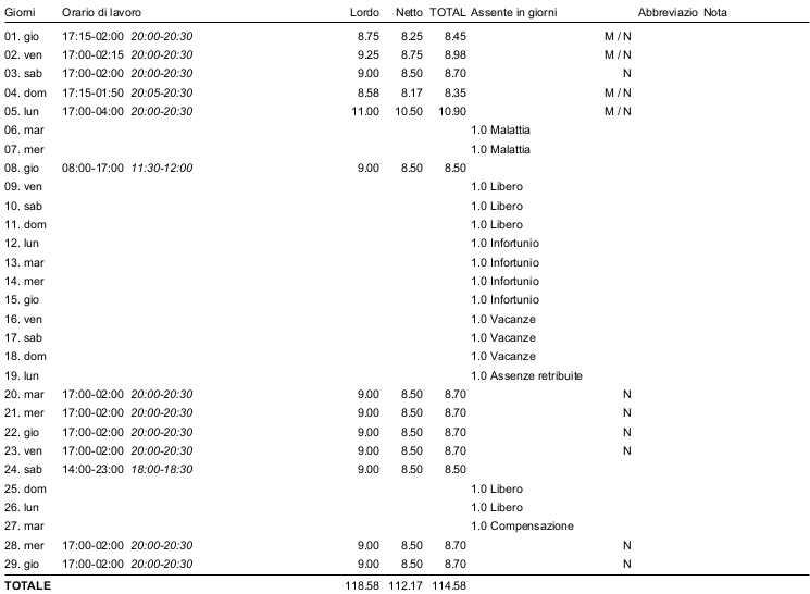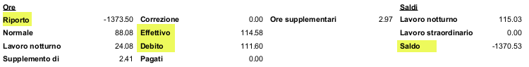 Netto (lavoro normale + notturno) + supplemento per lavoro notturno = Totale (ore effettive)