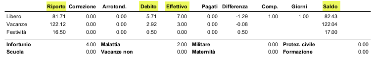 Riporto (Saldo del mese precedente) + Debito (diritto) - Effettivo (prelievo) + compensazione/giorni supplementari = Saldo