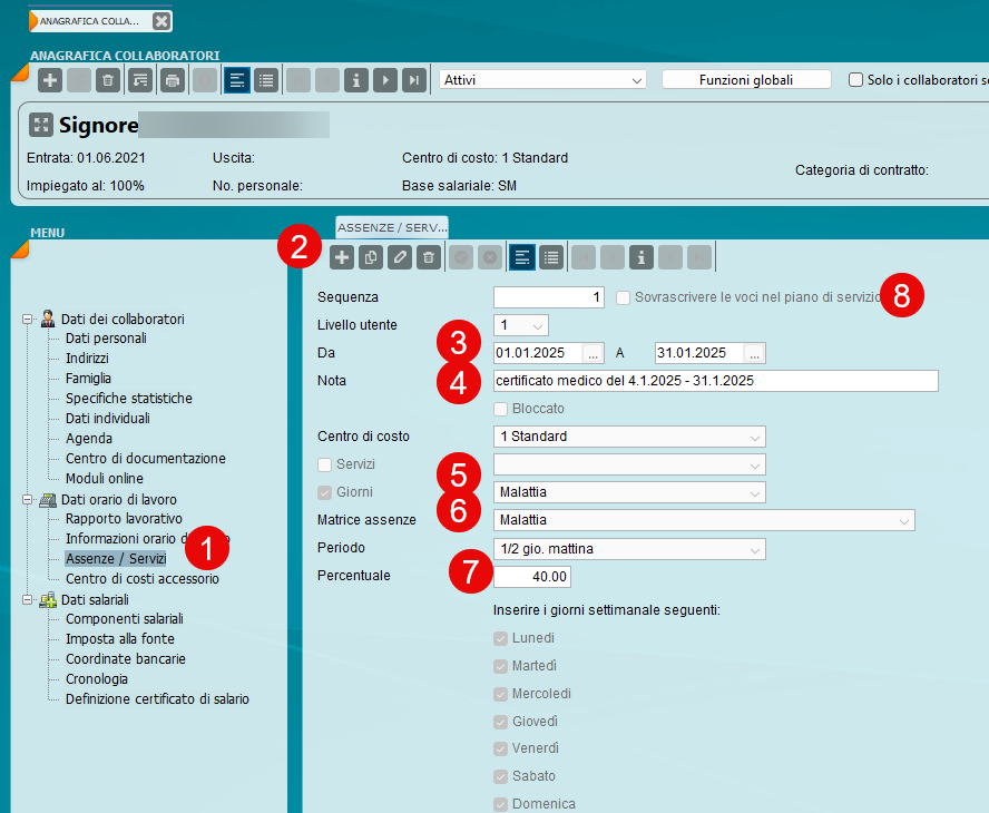 I dati registrati alla voce «Assenze/Servizi» sono limitati al mese di salario corrente e visualizzati direttamente nel conteggio salari. Il salario viene ridotto secondo quanto stabilito dall’art. 23 CCNL. Le incapacità lavorative parziali vengono convertite in giorni interi, esempio: 10 giorni di malattia al 50% vengono indicati nel conteggio del salario come cinque giorni di malattia.