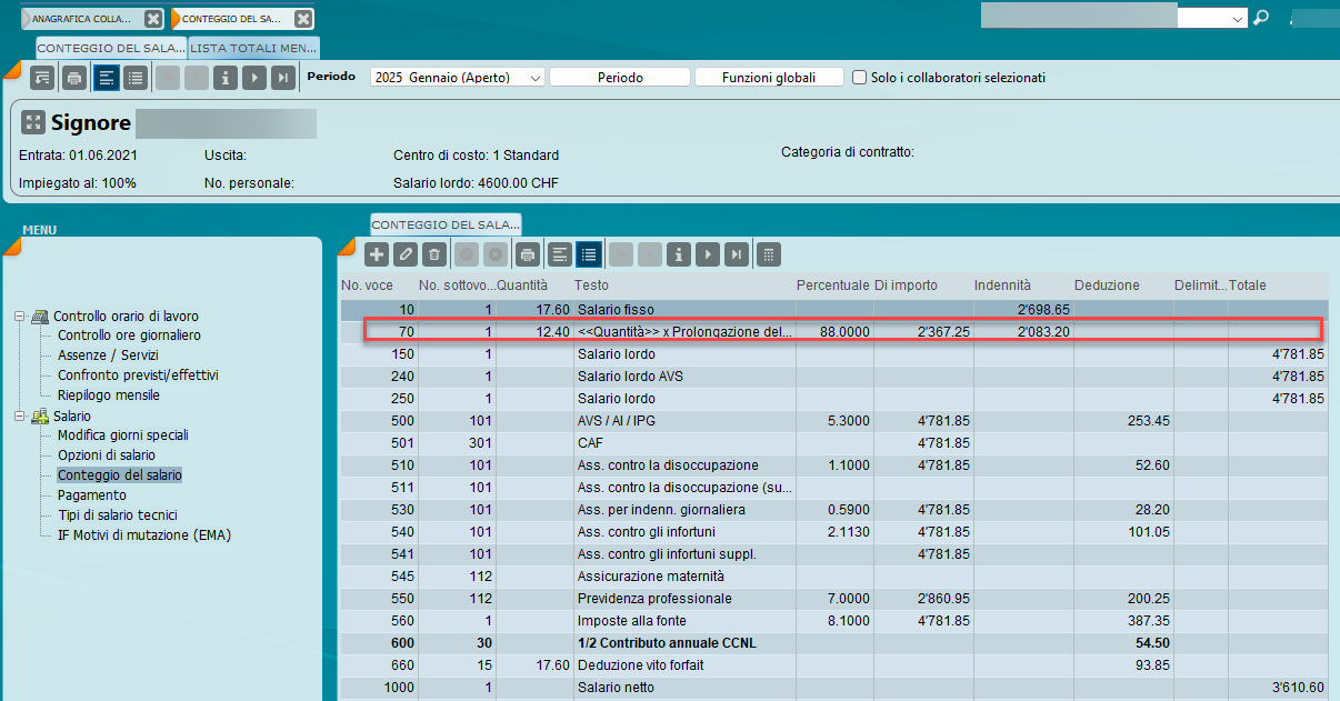 I dati registrati alla voce «Assenze/Servizi» sono limitati al mese di salario corrente e visualizzati direttamente nel conteggio salari. Il salario viene ridotto secondo quanto stabilito dall’art. 23 CCNL. Le incapacità lavorative parziali vengono convertite in giorni interi, esempio: 10 giorni di malattia al 50% vengono indicati nel conteggio del salario come cinque giorni di malattia.